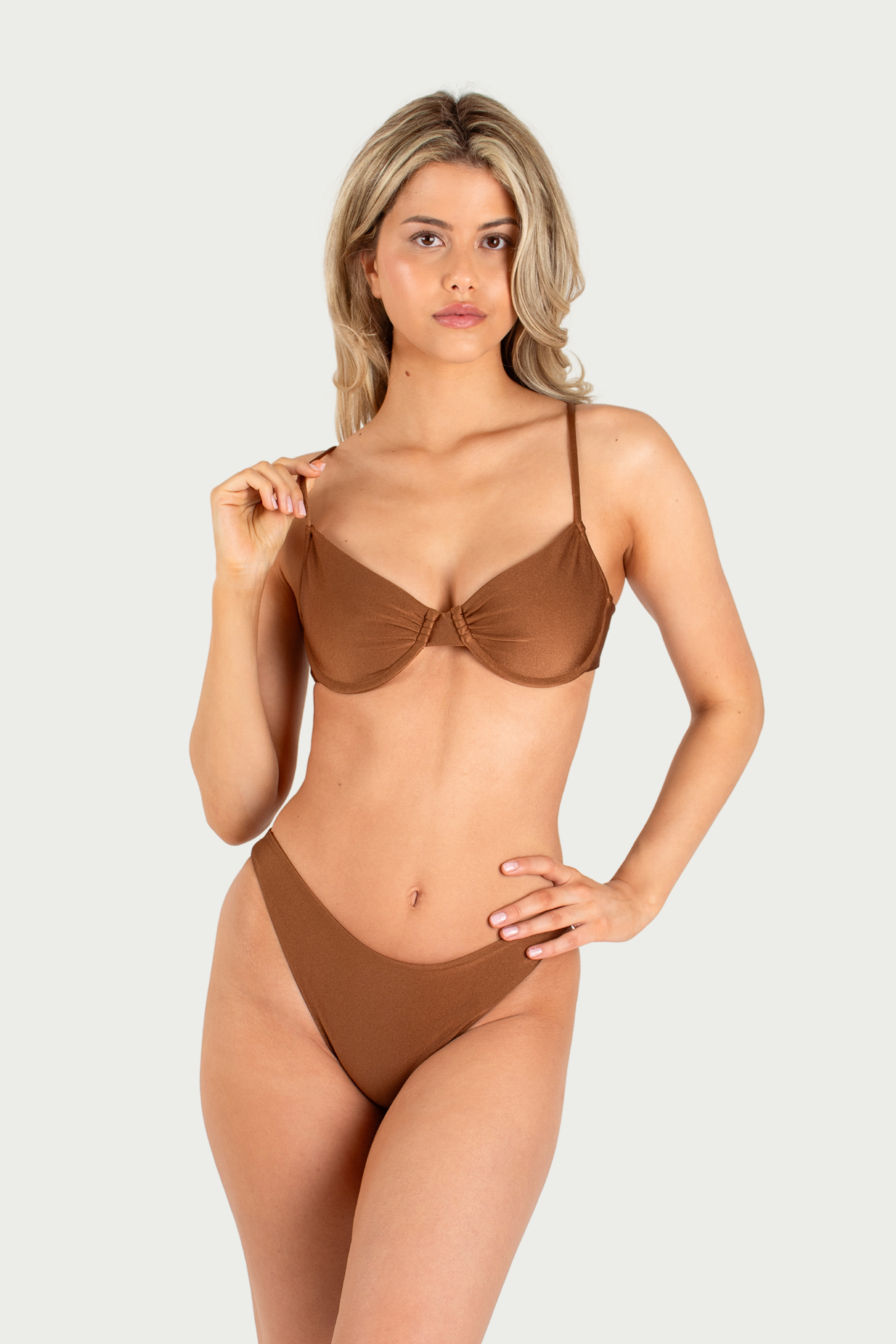 The Sloane is one of our best sellers with its supportive underwire design. It features a side cup adjuster for two different looks - full coverage cup or ruched cup. Designed with adjustable straps and a back tie, allowing you to find the most comfortable fit.
