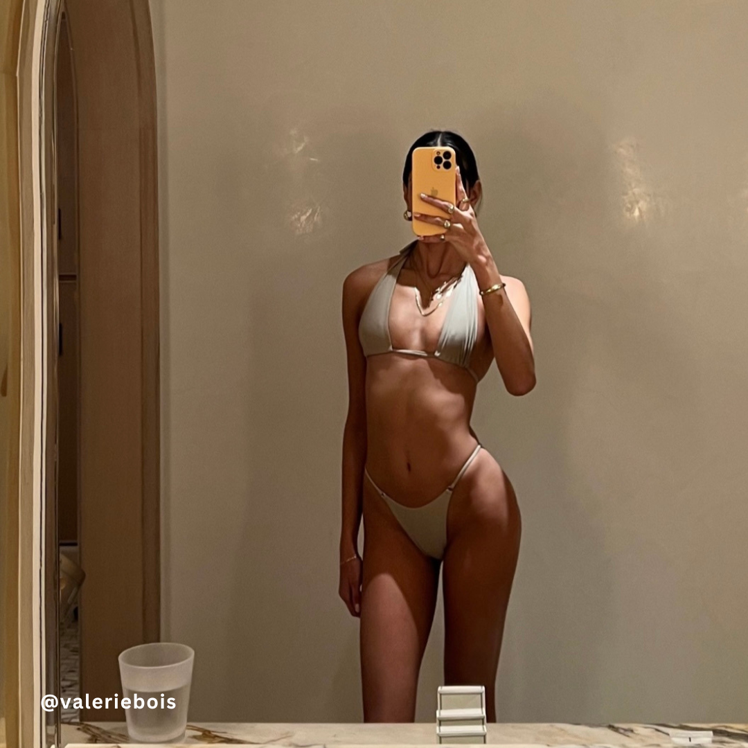 The Ivy, our tall triangle cup that lends more support with equal amounts of minimalism and sexiness. The ruched cups allow for custom bust coverage and features a long & thick back tie that can be tied 7+ ways.
