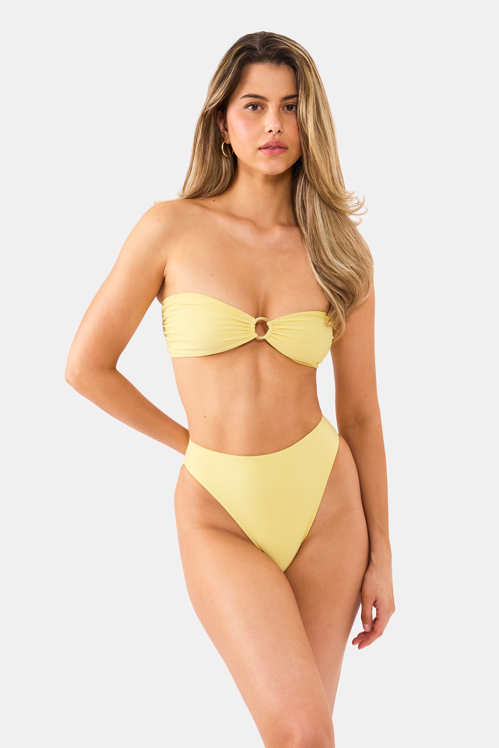The Isla top is the perfect bandeau style featuring gold hardware & our signature buttery soft Italian fabric that elevates your vacation look. Designed with an adjustable back tie to always give you control for the perfect fit.