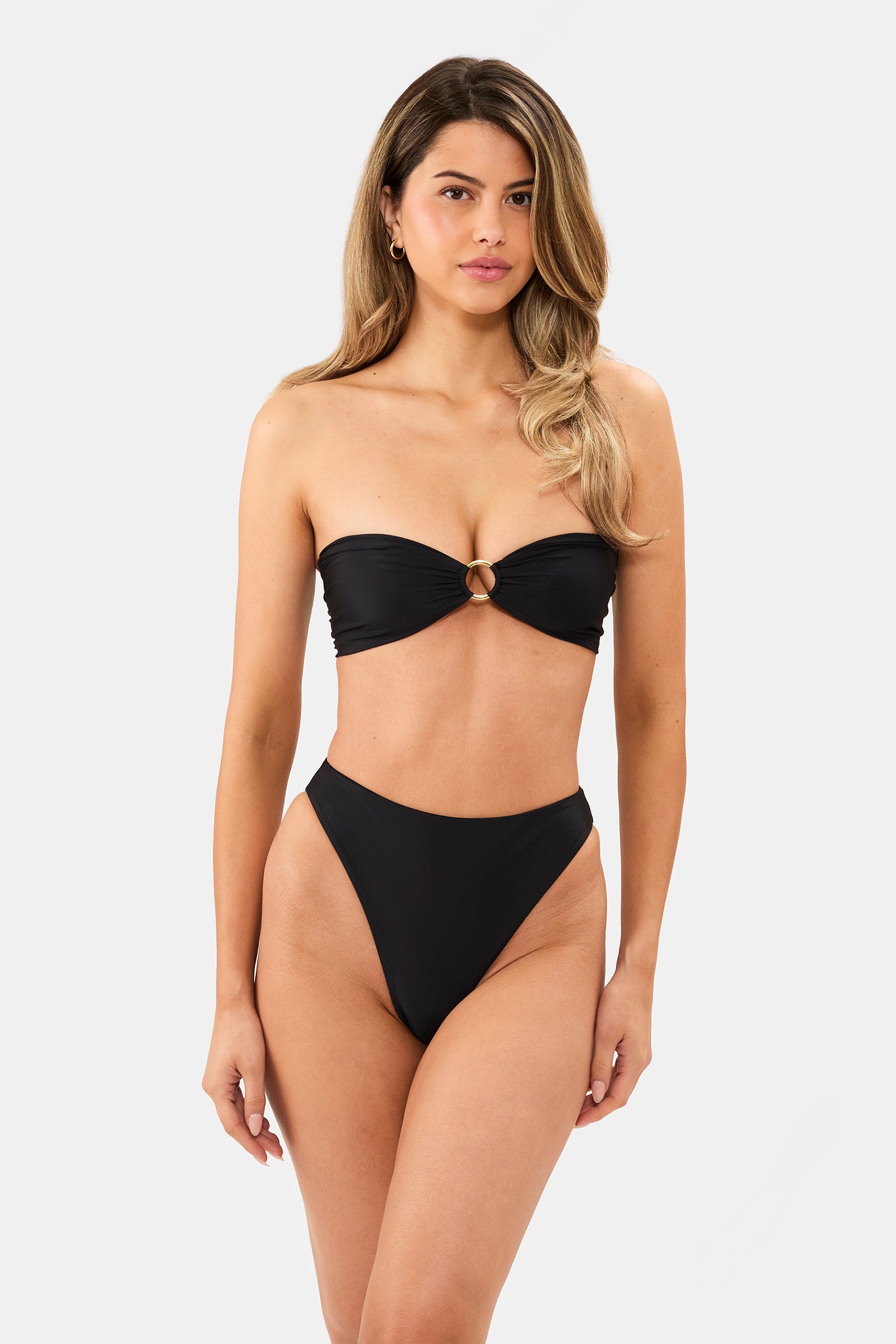 The Isla top is the perfect bandeau style featuring gold hardware & our signature buttery soft Italian fabric that elevates your vacation look. Designed with an adjustable back tie to always give you control for the perfect fit.